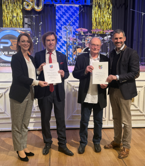 Erste Bürgermeisterin Julia Fischer, 2. Vorsitzender Burkard Schliessmann, 1. Vorsitzender Dieter Sattler, Landrat Alexander Legler